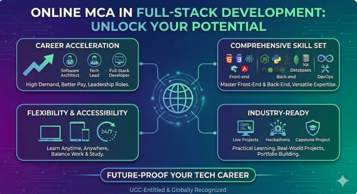 If you like coding, building apps, and solving problems, an online MCA in full-stack development is really useful. You learn front-end and back-end skills, work on projects, and get a wide range of career options.